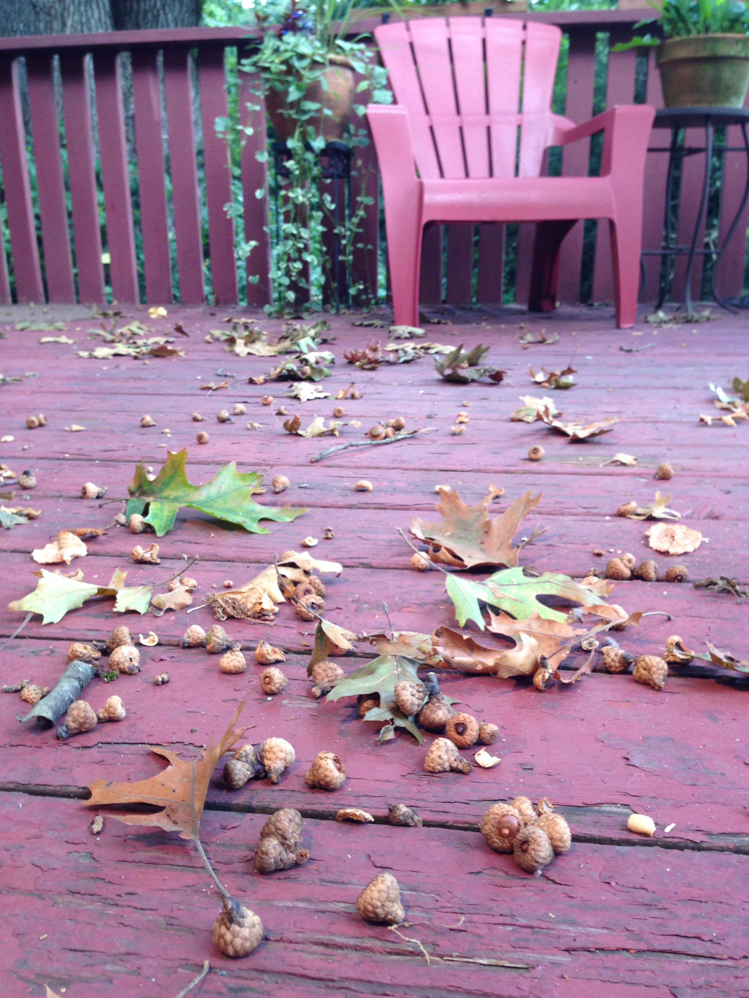 The oak trees are by far the worst offenders. It happens maybe once in a day, then several times a day until by the second week in August you have to make sure you’re positioned under a deck umbrella for protection. The first rounds of falling acorns are usually small and green and they fall from the sky like large raindrops. Then the squirrels begin their seasonal pillaging. They break open the nuts with reckless abandon and toss the shells overboard. Additionally there’s a barrage of sharp edged beechnut seeds that litter our path. Gone are the lazy summer days when you might step out on the deck in bare feet. You can’t even wear flip-flops: thick-soled shoes only, please! There is no safe place.